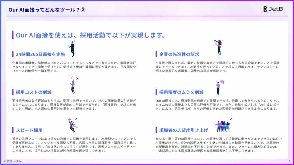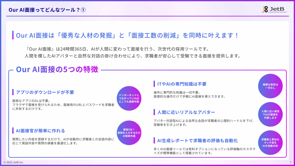 トップ > お役立ち資料 > サービス資料 – 3分でわかる『Our AI面接』 AI面接資料 サービス資料 – 3分でわかる『Our AI面接』 無料で資料を受け取る この資料でわかること Our AI面接の概要 Our AI面接の導入で解決できる課題 Our AI面接の導入で削減できたコストや得られた利益の事例 Our AI面接の費用感