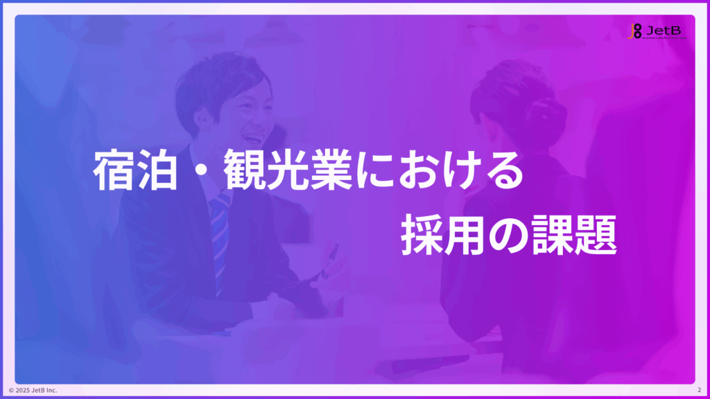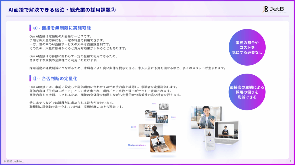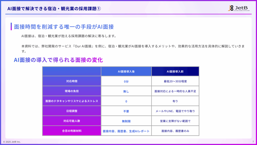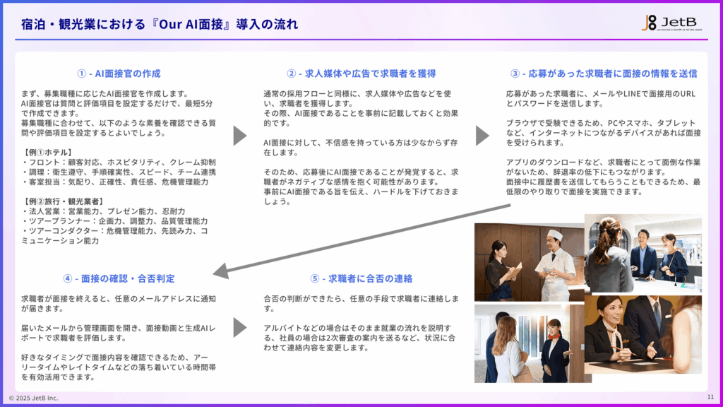 トップ > お役立ち資料 > 宿泊・観光業がAI面接で解決できる採用課題 – 業種別『Our AI面接』活用ガイド AI面接資料 宿泊・観光業がAI面接で解決できる採用課題 – 業種別『Our AI面接』活用ガイド 無料で資料を受け取る この資料でわかること 宿泊・観光業が抱える慢性的な採用課題 宿泊・観光業の採用課題がAI面接で解決できる根拠 宿泊・観光業における『Our AI面接』の導入フロー 『Our AI面接』を使った工数削減事例