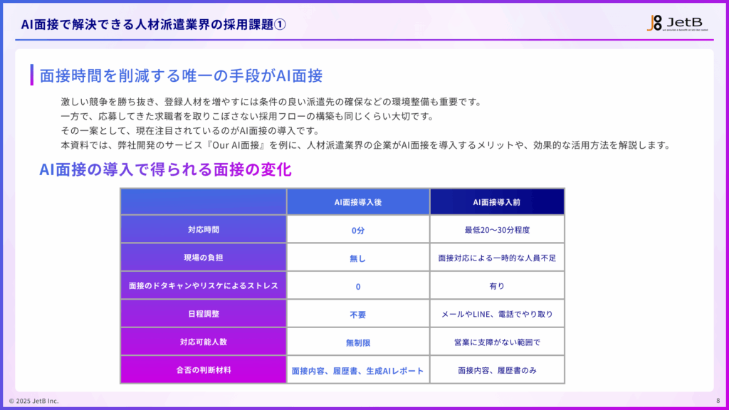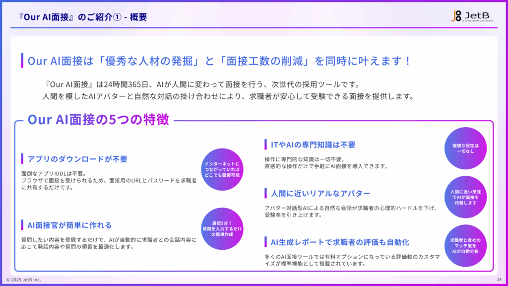 トップ > お役立ち資料 > 人材派遣業界の企業がAI面接で解決できる採用課題 – 業種別『Our AI面接』活用ガイド AI面接資料 人材派遣業界の企業がAI面接で解決できる採用課題 – 業種別『Our AI面接』活用ガイド 無料で資料を受け取る この資料でわかること 人材派遣業界の企業が抱える慢性的な採用課題 人材派遣業界の採用課題がAI面接で解決できる根拠 人材派遣業界の企業における『Our AI面接』の導入フロー 『Our AI面接』のサービス概要